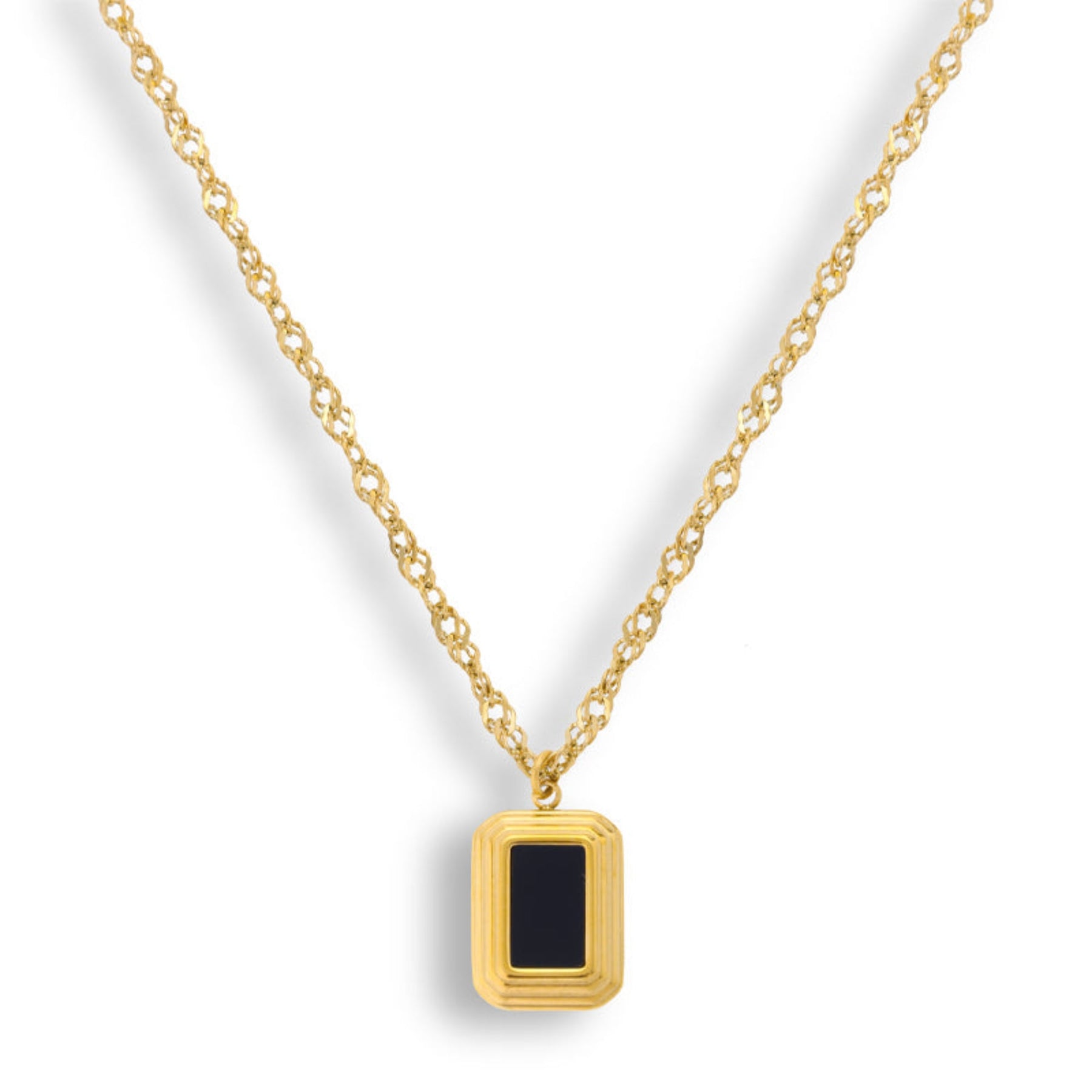 Accentuate your style with the adorable Eden Necklace. This cute necklace features a Singapore chain and rectangular pendant, adorned with a stunning black stone. Embrace its unique design and stand out from the crowd.