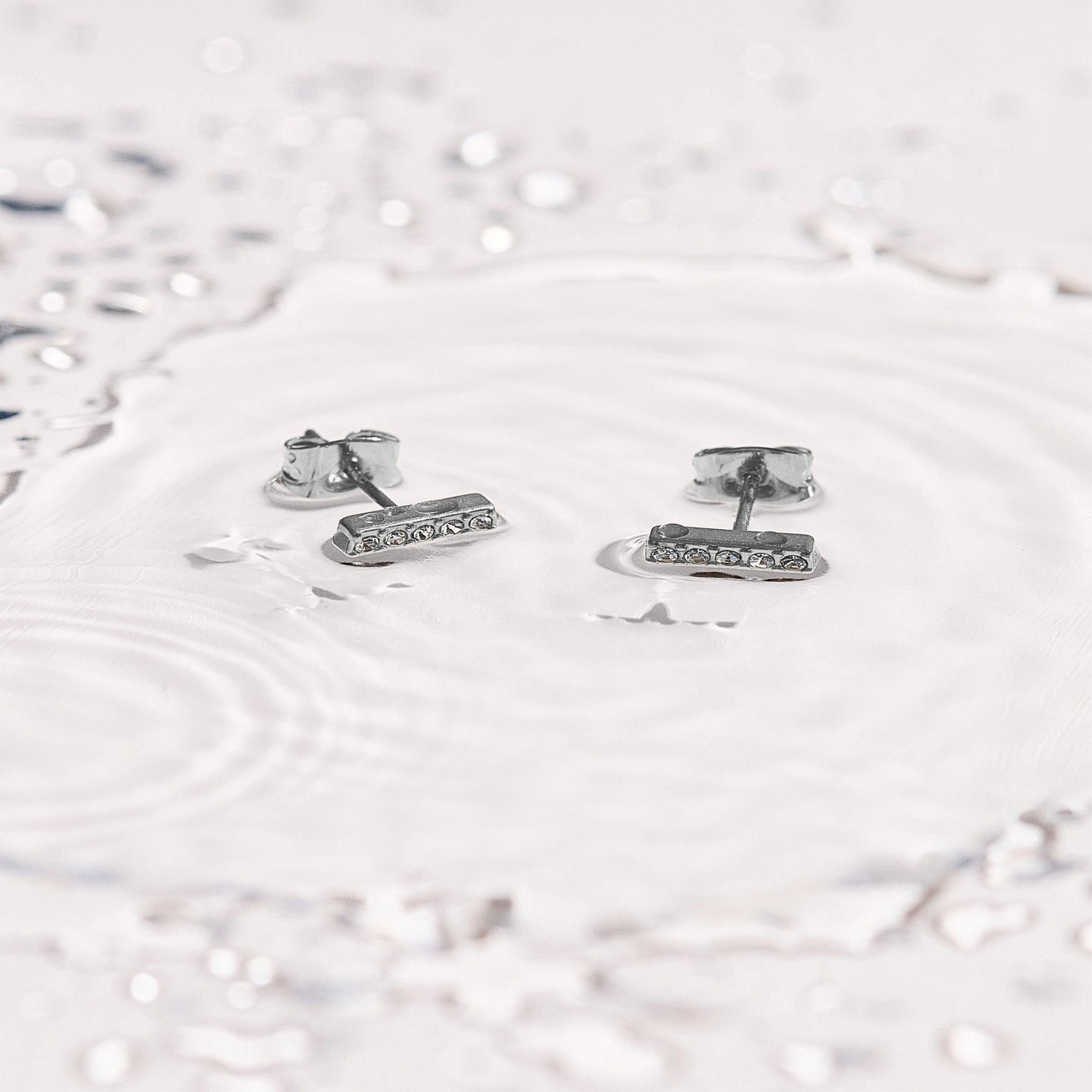 Modern and minimal with a touch of sparkle, these bar stud earrings feature a sleek rectangular design set with a row of round-cut crystals. Their geometric shape and polished finish make them the perfect pair for everyday wear or layering with multiple piercings for a stacked look.