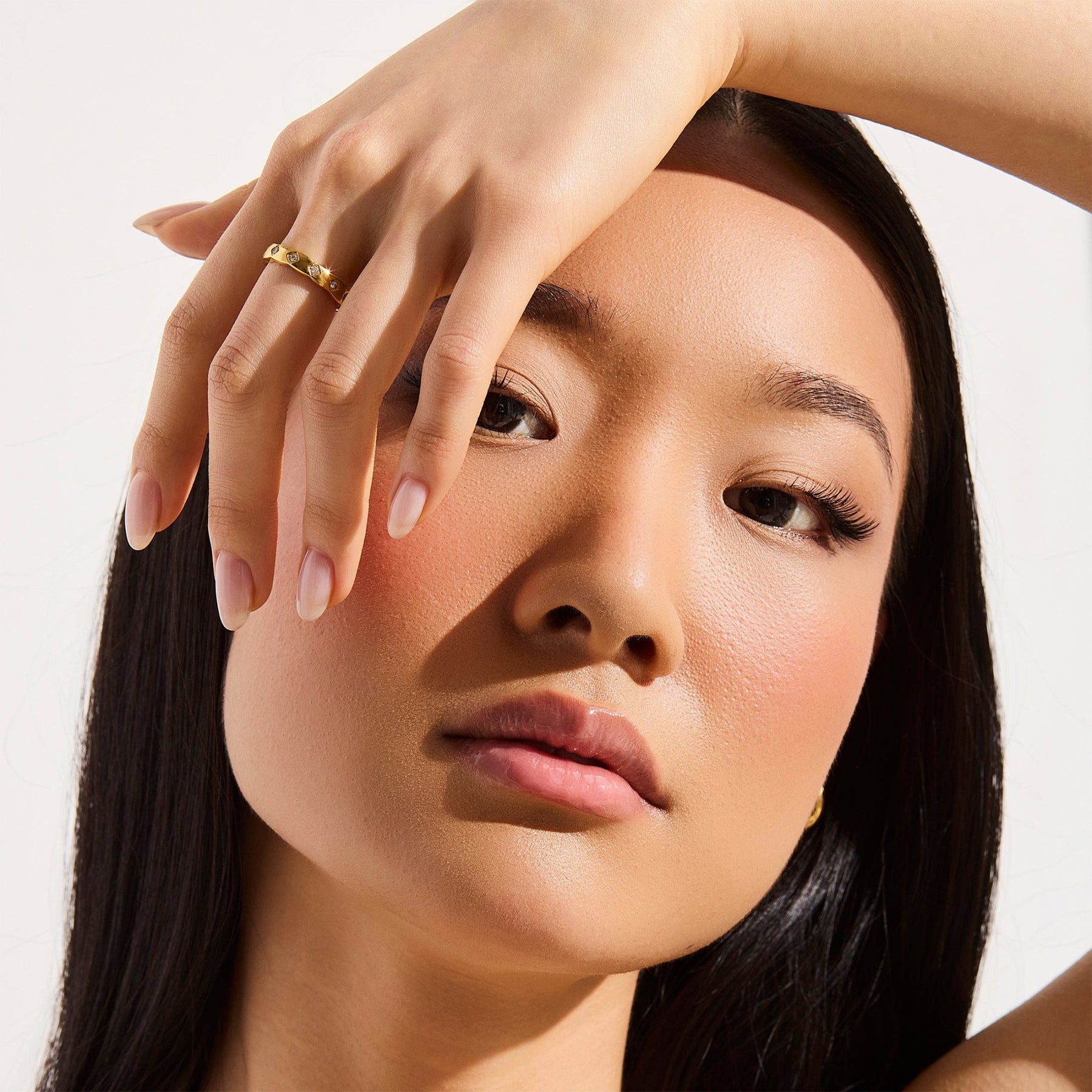 This modern twist band is detailed with round crystals nestled in sculpted diamond-shaped insets, adding depth and a hint of sparkle. Its smooth curves and polished finish make it ideal for stacking or wearing on its own. A sleek and versatile everyday favorite.