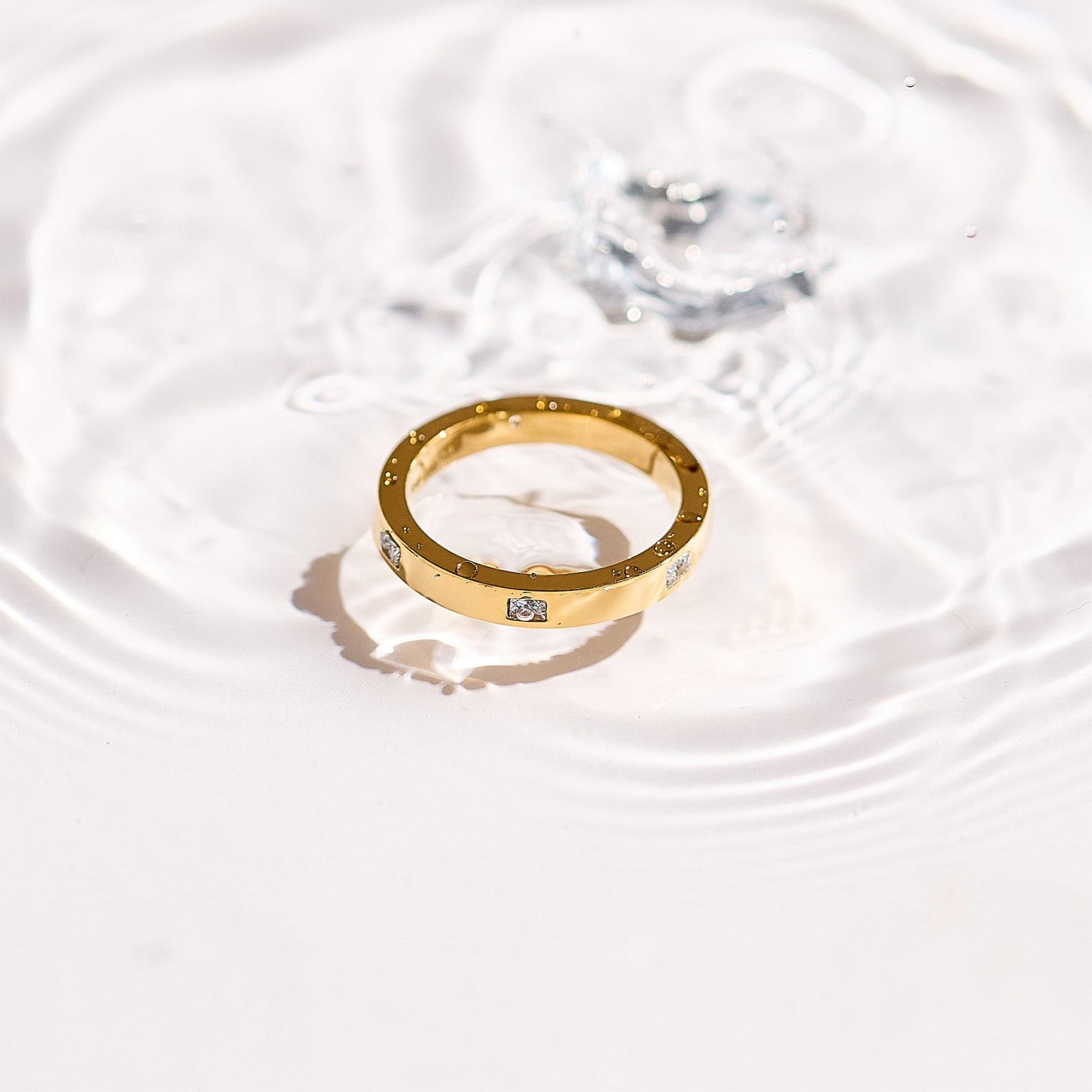 Clean, modern, and minimal—this flat band ring features evenly spaced square-cut crystals set flush into a smooth polished surface. With its subtle sparkle and structured silhouette, it's a versatile piece that stacks beautifully or makes a sleek statement on its own.